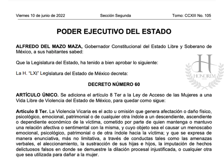 El pasado 10 de junio de 2022, el Gobierno del Estado de México, por conducto del decreto número 60, integró esta figura a la la Ley de Acceso de las Mujeres a una Vida Libre de Violencia del Estado de México, con la finalidad de combatir esta forma de violencia con todo el poder del Estado.